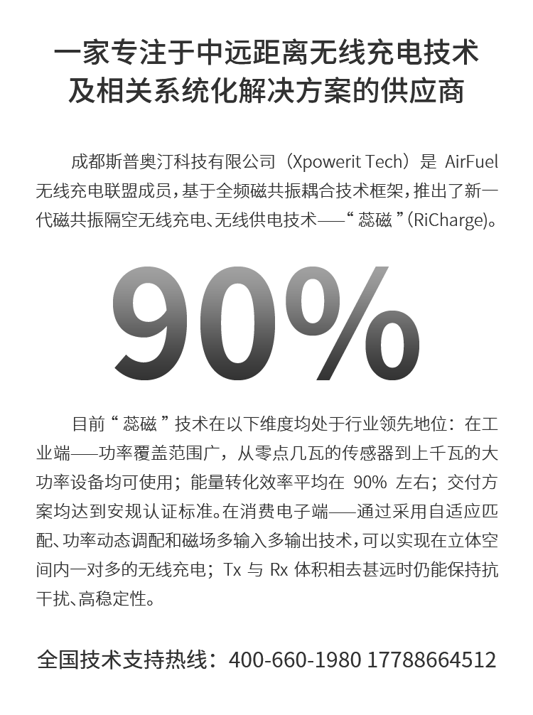 成都斯普奧汀科技有限公司(Xpowerit Tech)是一家專(zhuān)注于中遠(yuǎn)距離無(wú)線(xiàn)充電技術(shù)及相關(guān)系統(tǒng)化解決方案的供應(yīng)商。公司為AirFuel無(wú)線(xiàn)充電聯(lián)盟成員,基于全頻磁共振耦合技術(shù)框架,推出了新一代磁共振隔空無(wú)線(xiàn)充電、無(wú)線(xiàn)供電技術(shù)——“蕊磁”(RiCharge)。 目前“蕊磁”技術(shù)在以下維度均處于行業(yè)領(lǐng)先地位:在工業(yè)端——功率覆蓋范圍廣,從零點(diǎn)幾瓦的傳感器到上千瓦的大功率設(shè)備均可使用;能量轉(zhuǎn)化效率平均在90%左右;交付方案均達(dá)到安規(guī)認(rèn)證標(biāo)準(zhǔn)。在消費(fèi)電子端——通過(guò)采用自適應(yīng)匹配、功率動(dòng)態(tài)調(diào)配和磁場(chǎng)多輸入多輸出技術(shù),可以實(shí)現(xiàn)在立體空間內(nèi)一對(duì)多的無(wú)線(xiàn)充電;Tx與Rx體積相去甚遠(yuǎn)時(shí)仍能保持抗干擾、高穩(wěn)定性。